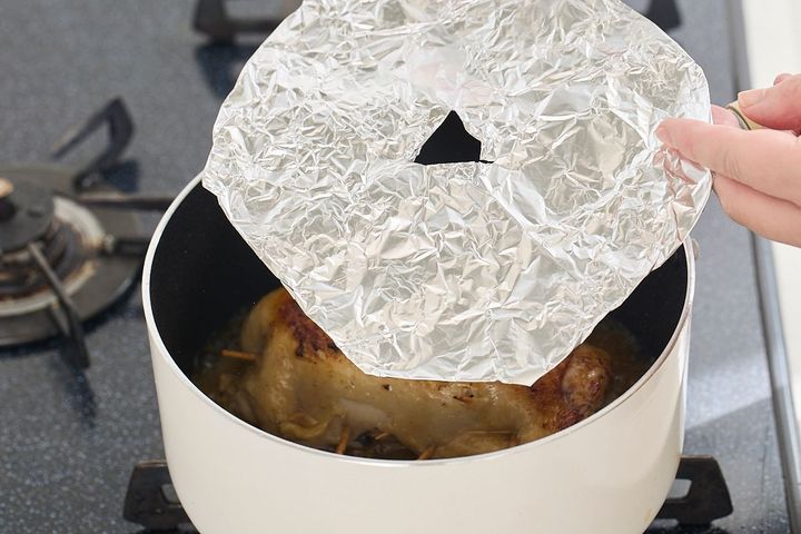 6.水、(4)で残しておいたたれを加えたら弱火にし、アルミホイルなどで落としぶたをして10分煮る。
