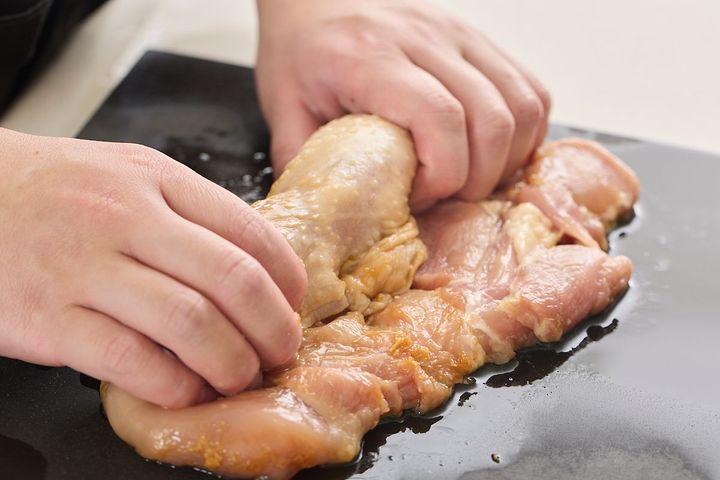 2.鶏肉は分厚い部分に切り込みを入れて、切れ目から左右に切り込みを入れ、身を開く(観音開き)。