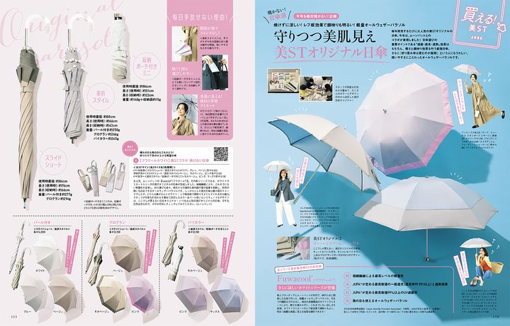毎年大人気の美STオリジナル日傘が今年も登場。昨年に引き続き、ムーンバットとのコラボで、春先からの強烈な紫外線や夏の猛暑を遮断し、突然の雨にも対応できるオールウェザーパラソル。スタッフが何度も打合わせを重ねて決定した自信作です。今年も完売必至なので、ぜひお早めにチェックしてみて。