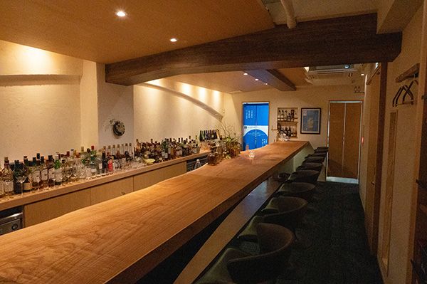 階段を降りて行くと瀟洒な坪庭があり、どこか和食屋さんのような雰囲気が漂います。 引き戸を開けると、目に飛び込んでくるのは一枚板の長いカウンター。