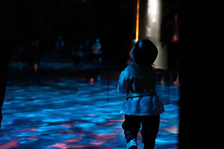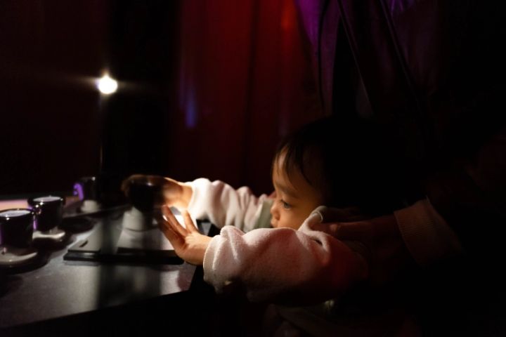 予約時間になって部屋に入ると、そこは真っ暗。2歳の娘がちょっと怖いなと感じるぐらい没入感を味わえます。ここから雨水が温泉水になるまでの旅がはじまります。