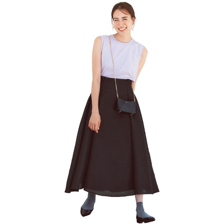 ボリューミーな黒スカートと黒パンプスの組み合わせに、ラメ入り靴下で抜け感をプラス。涼しげなシルバーラメは夏コーデにもフィットします。靴下は裾から素肌が覗くくらいの丈がベスト。靴下はタビオ、靴はファビオ ルスコーニ。