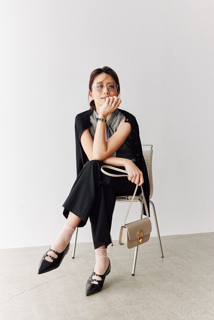 シンプルなモノトーンコーデに靴下・バレエだと物足りなくなるところ、メリージェーンのストラップがいい仕事をしています。靴はファビオ ルスコーニ。