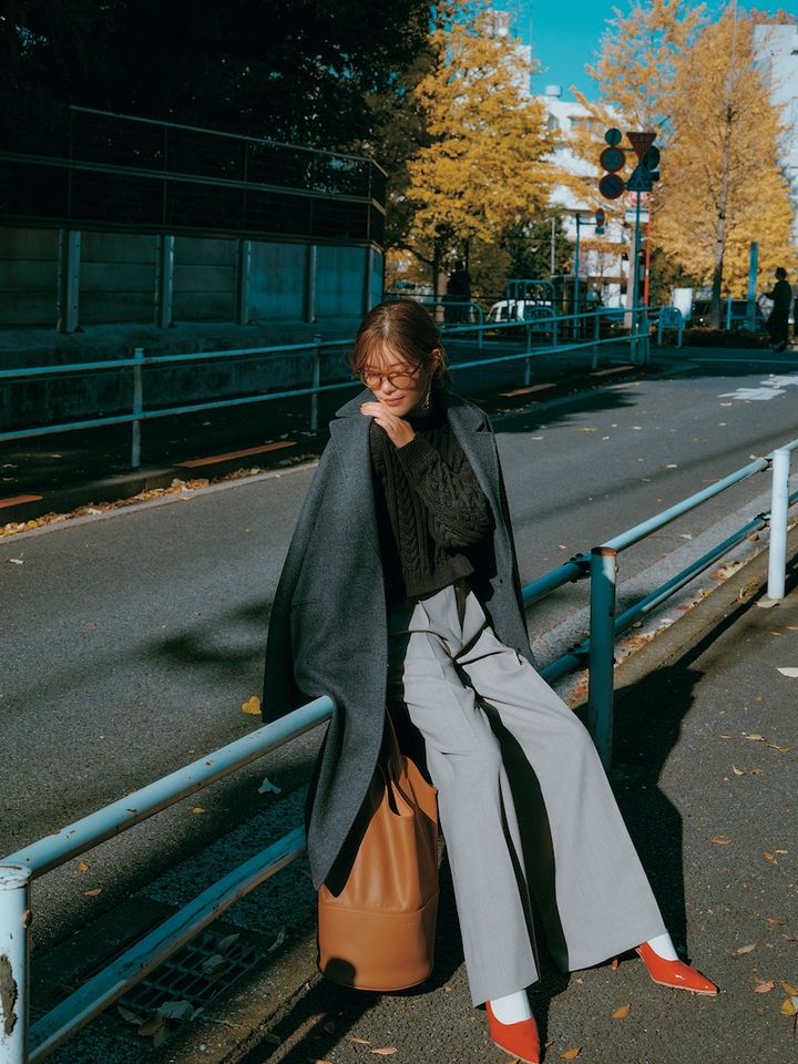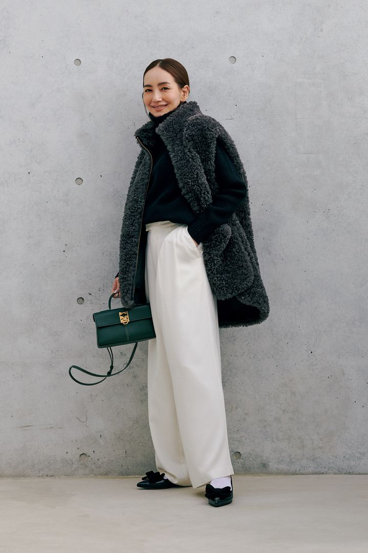 いつものモノトーンコーデ合わせなら安心感も。あえてゆるっとしたシルエットに合わせるのが可愛い。靴はアダム エ ロペ。