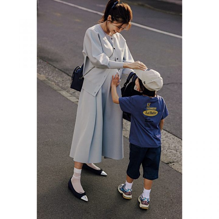 ぺたんこパンプスにも透け感のある靴下がコーデにアクセントをつけつつ、マタニティ期に冷やしたくない足首をやさしく包んでくれます。靴下はデミルクスビームス、靴はル タロン。