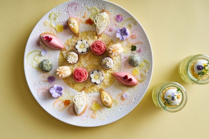 スイーツプレートは、ピンク色のローズをイメージしたライチとフランボワーズのムースや、カモミールとハチミツが香るオレンジのマカロン、マンゴーとジャスミンのムース、トンカ豆とアプリコットのタルトなど“フラワー”をデザインしたパステルカラーのスイーツが並びます。