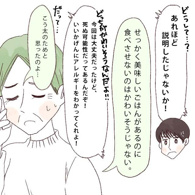 こう太の突然のアレルギー反応の原因は、私たち夫婦が目を離した一瞬の隙に義母が卵料理をこう太に食べさせたことでした。「こんなことになるなんて思わなかった」言う義母に、これまで何度もアレルギーの説明をしてきた私は怒りを通り越してもはや恐怖でしかありません。