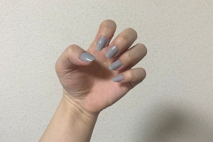 完成はこんな感じ! ジェルネイルといえば、爪に厚みが出て窮屈という印象ですが、マニキュアのような薄さなので、窮屈さを感じませんでした。たった1分硬化しただけでジェルが乾いてサラサラになるので、ネイルをしている時間もノンストレス。約3分ほどで1本のネイルが完成するので時間がかからず、これなら気分を変えたいときにネイルもサッと変えることができるのが、個人的に嬉しいポイントでした。