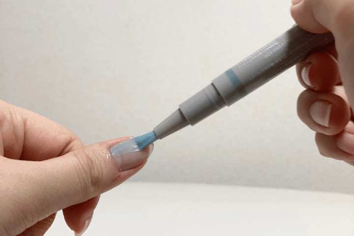 まずはジェルを筆に染み込ませます。ペンの後ろを10~15回ほどくるくると回すと画像のようにジェルが出てきます。出てくるまで少し時差があり、回しすぎるとジェルが垂れてくるので回しすぎには注意してください。