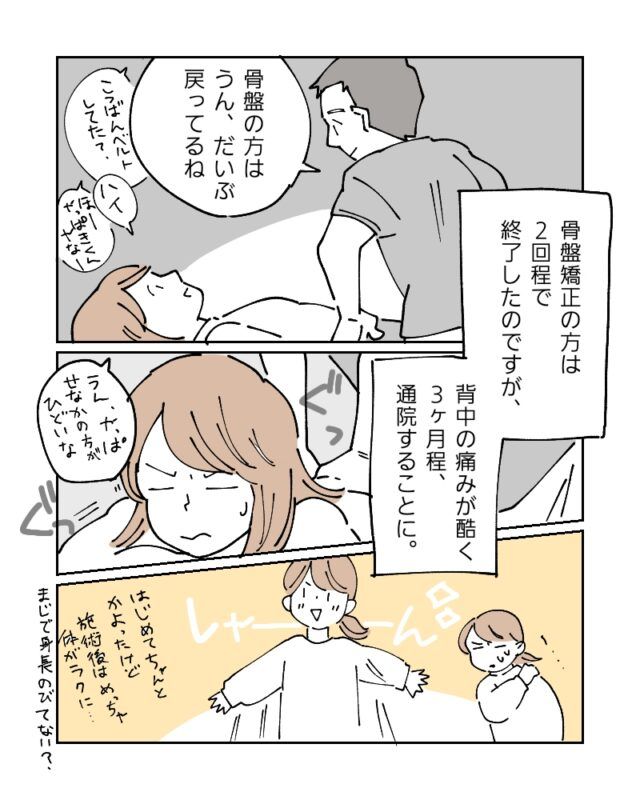 幸い、骨盤矯正は2回程で終了したのですが、背中の痛みがひどく3ヶ月程通院することに。