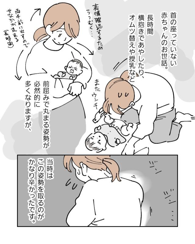 首の座っていない赤ちゃんのお世話、長時間横抱きであやしたり、オムツ替えや授乳など、前かがみで丸まる姿勢が必然的に多くなるのですが・・当時は、この姿勢をとるのがかなり辛かったです。