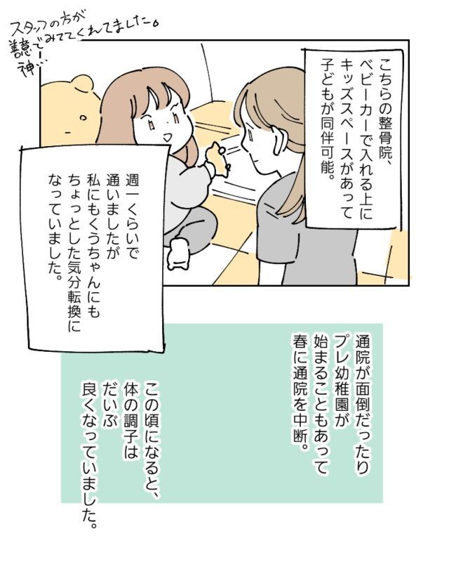 こちらの整骨院、ベビーカーで入れる上にキッズスペースがあって子どもが同伴可能。週一くらいで通いましたが、私にもくうちゃんにもちょっとした気分転換になっていました。