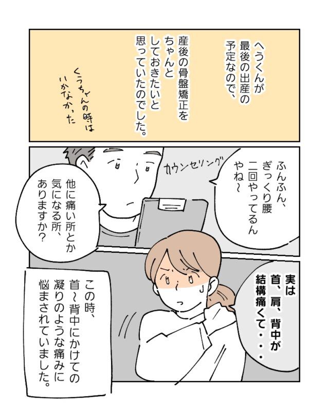 へうくんが最後の出産の予定なので、産後の骨盤矯正をちゃんとしておきたいと思っていたのでした。