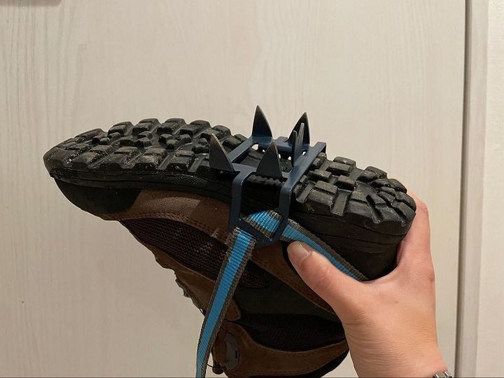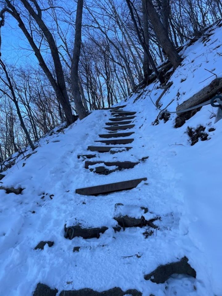 滑りやすいところもあるので、冬はアイゼンとストックが必須。アイゼンは靴底につける登山用具で、氷や雪の上でも滑りにくいよう「爪」がついています。