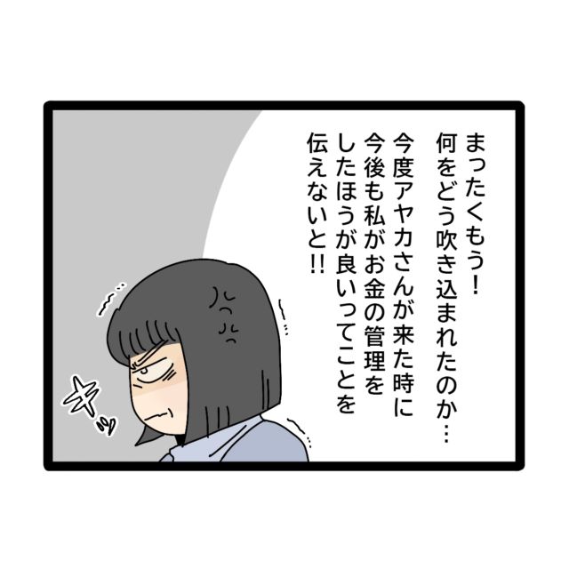 「まったくもう!何をどう吹き込まれたのか・・今度アヤカさんが来た時に、今後も私がお金の管理をしたほうが良いってことを伝えないと!!」