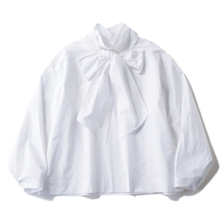 顔まわりがパッと華やぐボウタイデザイン。ボウタイは前後でアレンジが可能。ブラウス¥18,700(ユナイテッドアローズ/ユナイテッドアローズ 丸の内店)