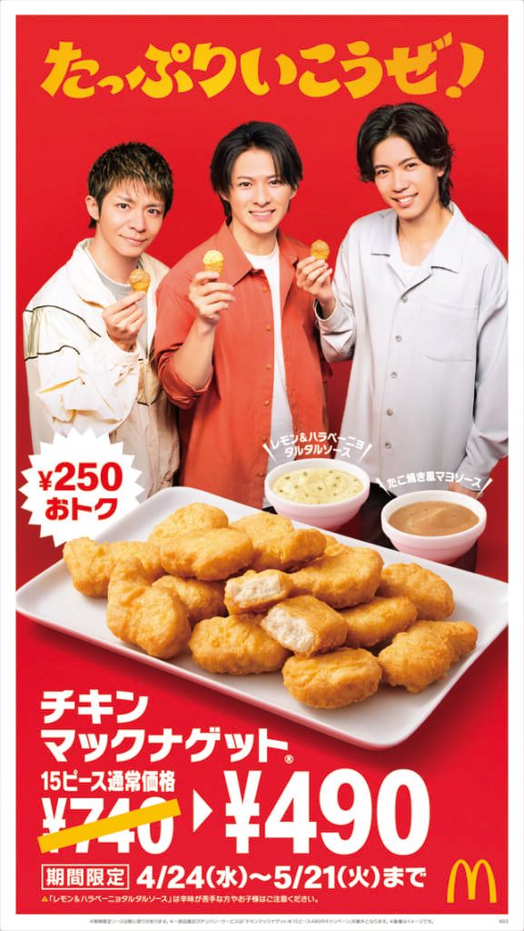 マクドナルドは、4月24日(水)〜5月21日(火)の4週間限定で、「チキンマックナゲット®15 ピース」を通常価格より250円お得な特別価格490円で販売します。GW にぴったりな期間限定ソース「レモン&ハラペーニョタルタルソース」と「たこ焼き風マヨソース」が新登場! さらに、4月23 日(火)から放映予定の新TVCM は「Number_i」(ナンバーアイ)がグループで出演する初のCMとなります。お得になるのもうれしいし、新CMも新ソースも気になる〜!