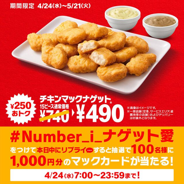 マクドナルド公式X アカウント(@McDonaldsJapan)をフォローし、同アカウントから投稿された「#Number_i_ナゲット愛」のハッシュタグが付いた投稿に「#Number_i_ナゲット愛」を付けてリプライすると、抽選で 100 名に1,000 円分のマックカードが当たるキャンペーンが、2024年4月24日(水)7:00~23:59に開催されます。