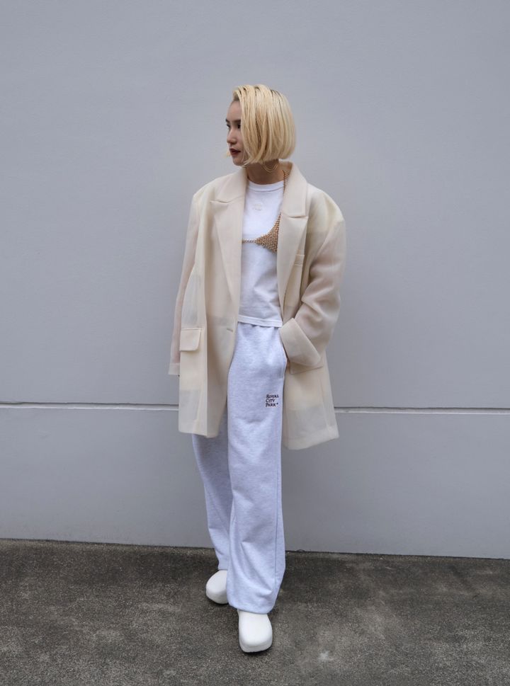 「ホワイトをメインにライトトーンでまとめたスタイルは、オーバーサイズのシルエットで着こなしにニュアンスを。スエットパンツのメンズライクな雰囲気は、一目惚れしたゴールドのチェーンブラと大ぶりのフープピアスで女性らしくシフト。どちらもこの春大活躍なお気に入りアイテムです」