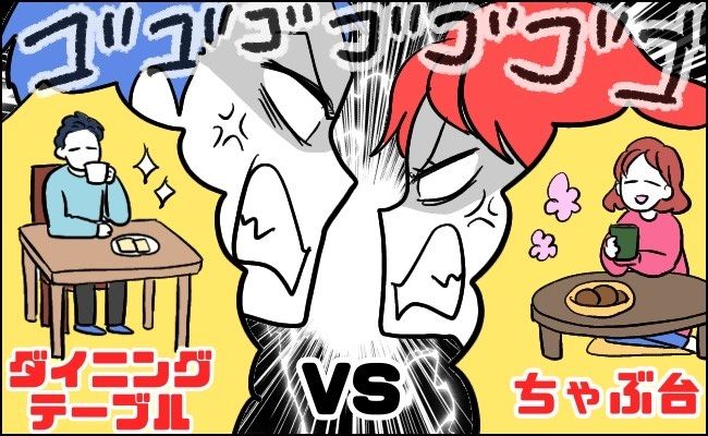 ラブラブな雰囲気で家具を選んでいたのに、食卓の趣味があわず、一気に険悪なムードに……。私は、ちゃぶ台を家族で囲んで食事を楽しみたいと考えているのに対して、夫は書き物など作業することを考えると絶対に机と椅子が欲しいと一歩も譲らず。
