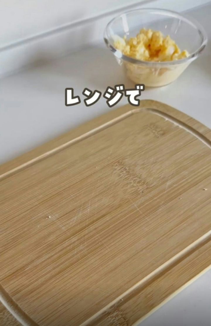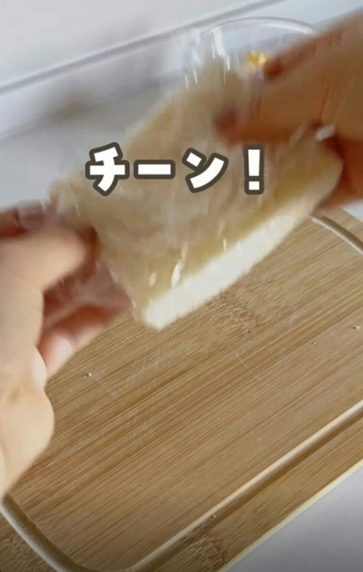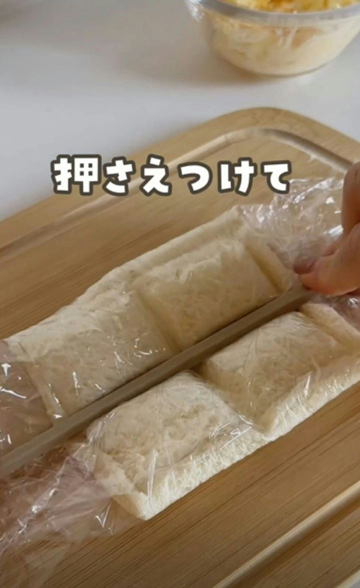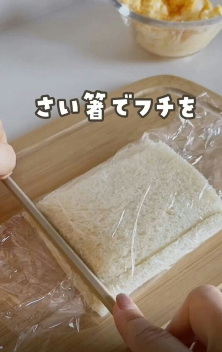 加熱後、ラップの上から菜箸を使って食パンのふちを押さえつけます。
