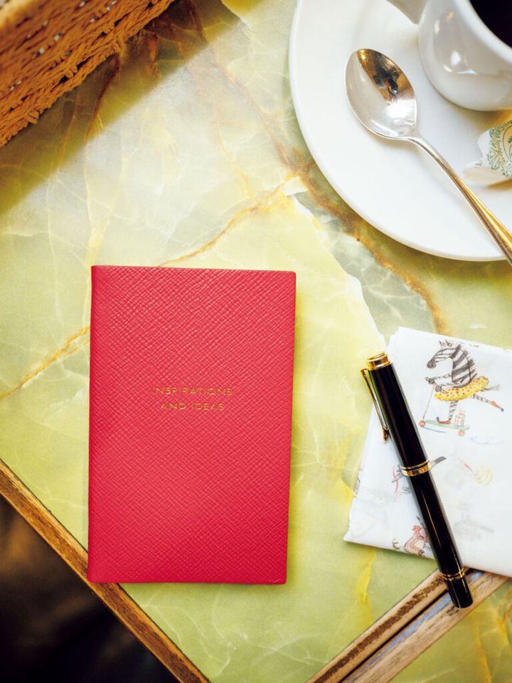 毎日使うペンを万年筆にしてみるように、ちょっとしたメモを書き留めるノートこそいいものを。ロイヤルワラントに認定される〈スマイソン〉のパナマノートは、ペールブルーの紙をめくるたびに心が躍る、上質なノートの代名詞。紙は軽くて万年筆でも裏抜けしないから機能的だし、ラムレザーのカバーも買ったその日から手に馴染む。ゴールドで刻印された「INSPIRATIONS AND IDEAS」の文字はクラシックで、使い終えても取っておきたくなる佇まい。¥11,000(ヴァルカナイズ・ロンドン 03−5464−5255) その他スタイリスト私物