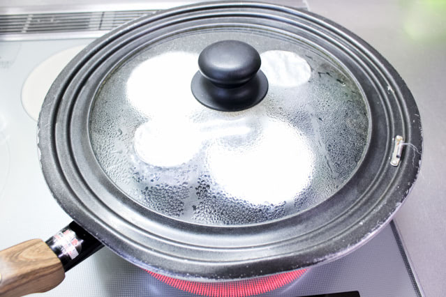 5.容器の1/3が浸かるくらいの水をフライパンで沸騰させ、沸騰したら火を止めてキッチンペーパーやふきんを沈めます。4の容器を並べたらフライパンにフタをし、弱火で8分蒸します。