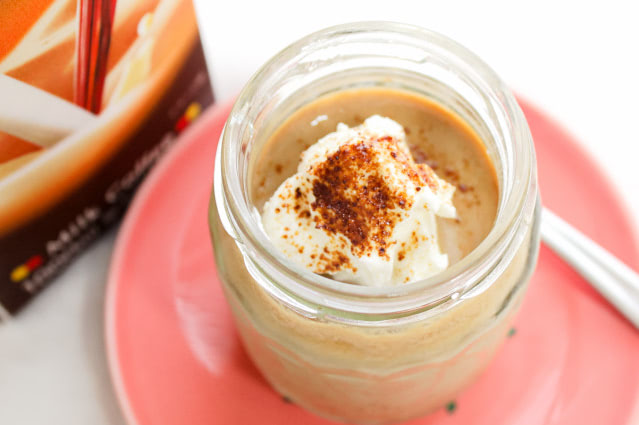 ホイップクリームにインスタントコーヒー(分量外)を少し振りかけると、カフェ風のプリンになりました。ホイップクリームのミルクの甘さとインスタントコーヒーの苦みがプラスされると、「コーヒー牛乳プリン」の味に立体感が出て、リッチな味わいになりましたよ♪