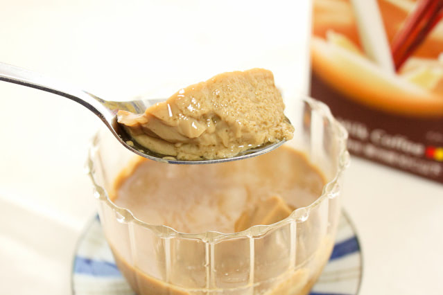 今回はシロップ状になったグラニュー糖を容器の底に入れて作りましたが、かすかにカラメル風味がした程度。ただ、カラメルのほろ苦さがなくても、コーヒー牛乳プリンは、とてもおいしくいただけました!