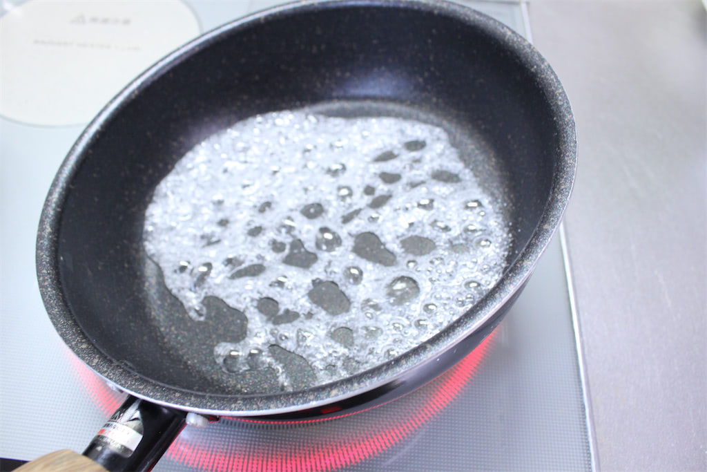 動画によれば、グラニュー糖はフライパン全体に広げるのではなく、出来るだけ1か所にまとめて入れるようにとのこと。水分が少ないから、小山のように1か所にこんもりと盛る方が、水が浸透しやすいのでしょう。30秒ほどで水が全体に行き渡りました。