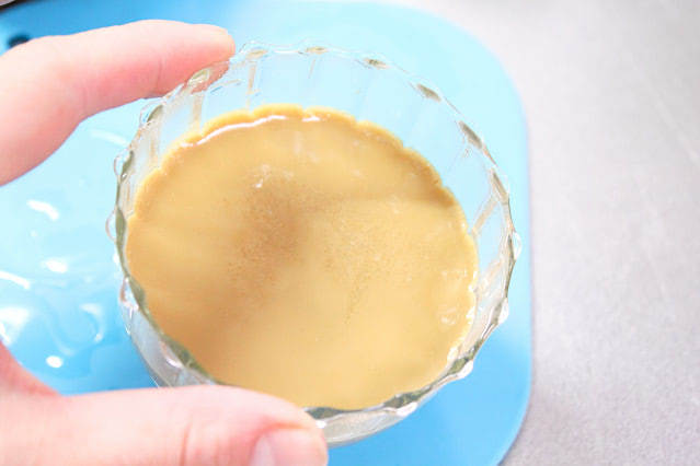 プリン液をザルで濾して2で用意しておいた容器に流し入れます。