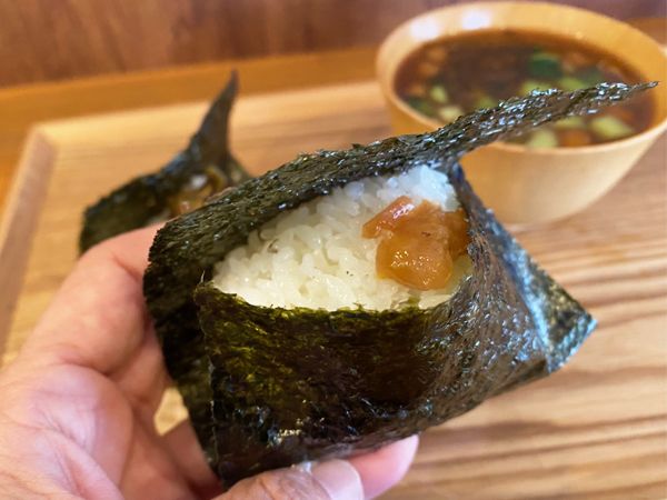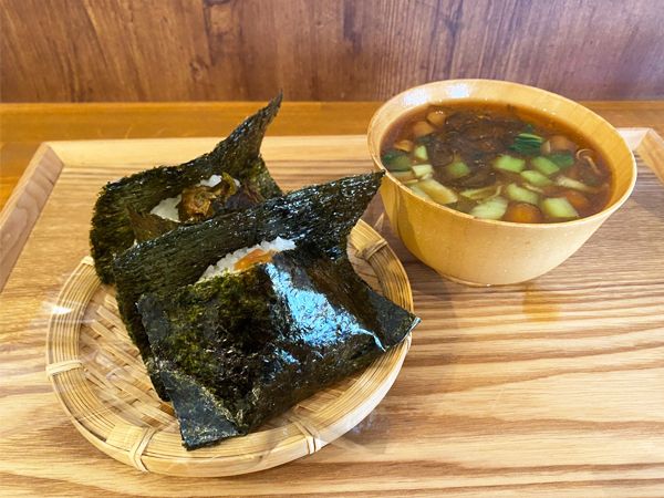 朝食セットは、平日ならランチタイムも対応しているとか。朝に限らず、ランチとしても満足できるおにぎりとみそ汁でした。
