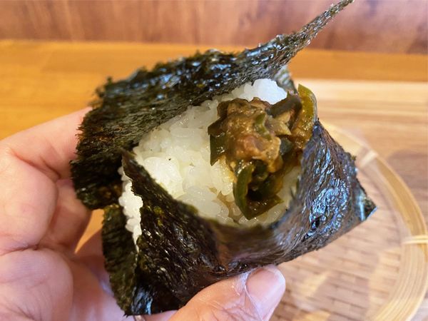 「ピーマンと青唐辛子」は、おにぎりの上部からかぶりつくと、とたんにピーマンの風味の濃い味わいとともにピリッときいた青唐辛子の辛さ! 白米多めで食べたくなる味わいでした。とはいえ、味付けは甘めのタレなので、その甘味もいい塩梅でした。