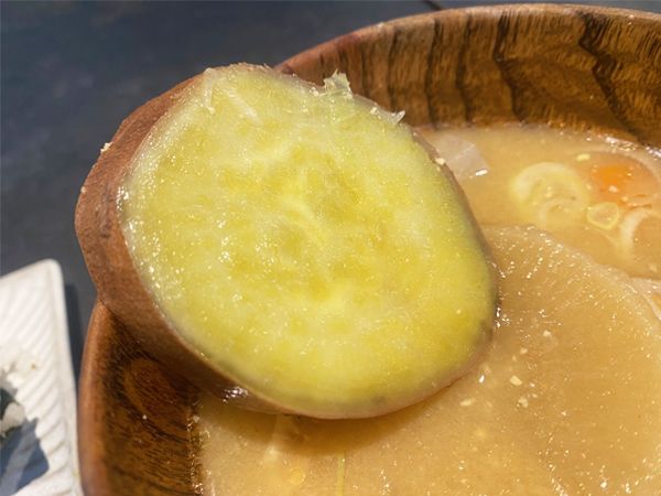 豚汁は、大きくカットした具材がインパクト大! 豚肉のほか、ダイコン、ニンジン、コンニャク、レンコン、サツマイモ、厚揚げがドドンッと入っていました。この食べ応えも迫力です。汁はコクがありながらもさっぱりとした味付けで「ボリュームある~」と思いながらもサラリと食べ切ってしまいました。