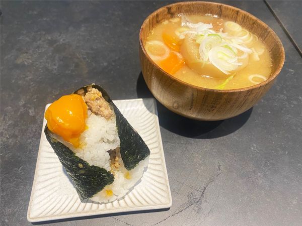 おにぎりは「肉そぼろ卵黄」を。待つこと数分。運ばれてきたおにぎりのサイズに、びっくり! 通常のおにぎりの1.5倍ほどのサイズなのです。豚汁の器も大きくて、おにぎりの大きさを伝えることができません…。
