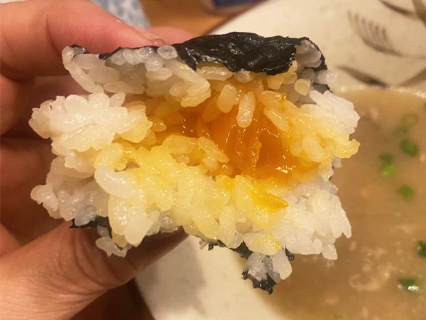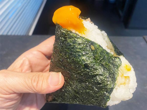 「肉そぼろ卵黄」は、おにぎりの上に卵黄がちょこんとのっているのがかわいらしい。ぱくりとかぶりつけば、卵黄のまったりとした味わいと肉そぼろのうまみが口中に広がっていきます。おにぎりの中には肉そぼろがたっぷりで、白米とのバランスもちょうどいい感じ。食べ応えのあるおにぎりでした。