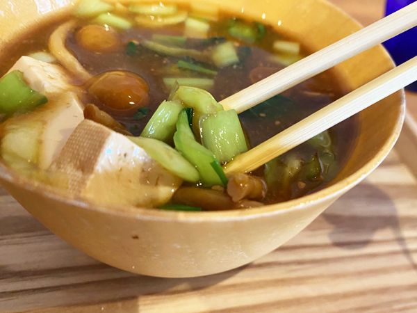 本日選んだのは、「すっぱい うめ」と「ピーマン青唐辛子」。オーダーされてからのりを巻いてくれるので、のりのパリッとした味わいが楽しめます。本日のみそ汁は赤みそで、なめこ、豆腐、もずく、小松菜と具だくさん。セルフサービスで受け取り、席に着きます。