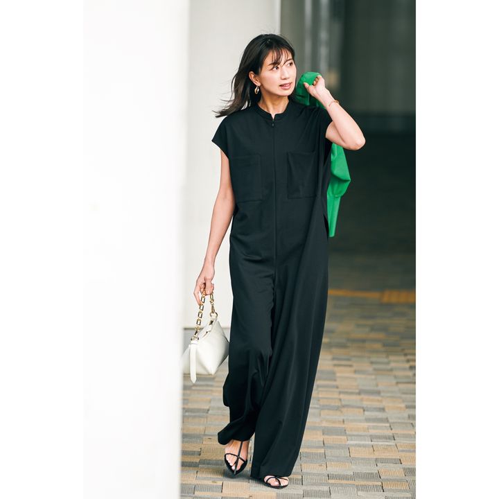 暑い日の参観日には涼し気なオールインワンを。くびれのないゆるシルエットでも、首元の詰まりやフレンチスリーブ、落ち感のある素材できちんと感が出せます。オールインワンはル フィル、バッグはダイアナのもの。