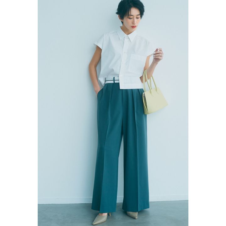ゆるタックパンツにショート丈シャツでバランスとトレンド感を両立。INせずともシャツのもつきちんとイメージで参観日スタイルに。シャツはオー・ゼロ・ユー、パンツはCITEN(シテン)、バッグはヴァジックのもの。