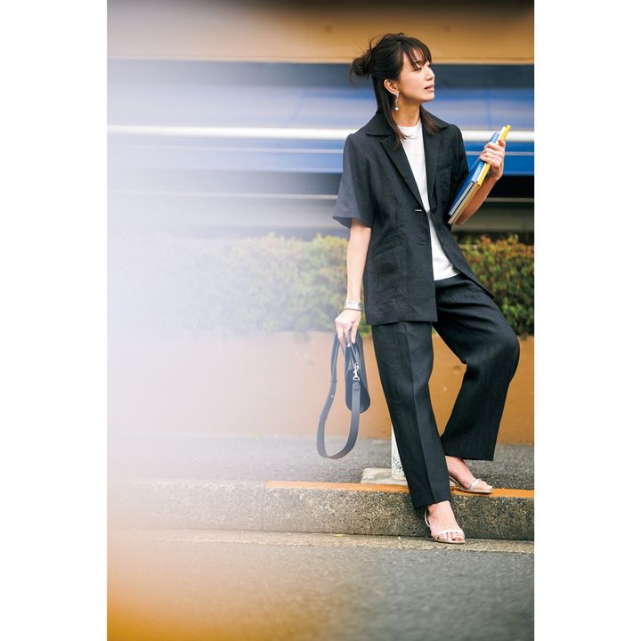 ゆるパンツもジャケットを着ちゃえばオールOK。こちらは、半袖ジャケットにゆるパンツという、ありそうでないセットアップ。ジャケットとパンツはカーサフライン、バッグはエポイのもの。