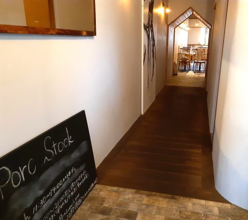お店の名前は「ポークストック」。ドキドキしながら扉を開けると、まだ静かな店内へ続く廊下が現れ、「いらっしゃいませ」と声が聞こえます。どうやら今日最初のお客さんになったようです。