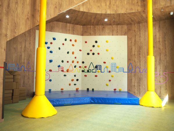 隣接の階段を上った吹き抜け・2階部分は、遊び心にドキドキをプラスするネット遊具になっていました。その他、1階奥の乳幼児一時預かり「はぐはぐポケット中央」にも専用の屋内遊び場がありました。