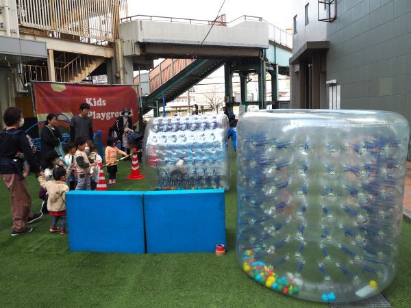 TeToTeはいはいレース(1階:遊びの広場) 屋外では、専属スタッフのサポート付きで楽しめるサイバーホイールに行列が。令和4年10月に全国で3番目、県内で初めて包括連携協定を締結した株式会社ボーネルンドの大型遊具で全身を使って転がして進む仕組み。他にも工夫を凝らしたおもちゃが多数イベント用として提供され、子育てファミリーも満足そうでした。