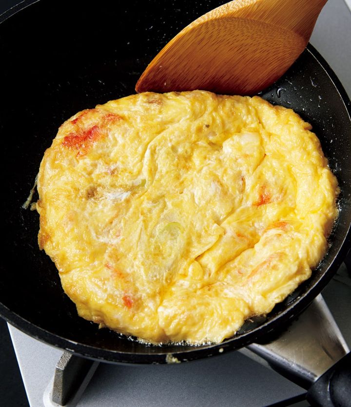 直径20㎝の小さめのフライパンで作ると、キレイな丸形が作りやすいです。卵は多めの油&強めの火加減で焼くと、ふわふわの食感に。