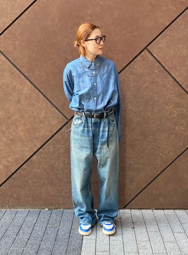 上下共にややオーバーサイズなのに女性らしく軽やかな印象なのは、しなやかなライトオンスのデニムシャツであることはもちろん、襟を抜いて袖をたくし上げ、ヌケのある着こなしを工夫しているから。