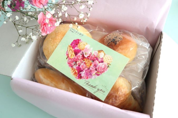 上記のセットをふくめ、その他の対象商品を、期間中に注文すると、パンの花束が描かれた癒しのオリジナルカードを添えて、華やかで優しいピンクのラッピングで配送してくれます。