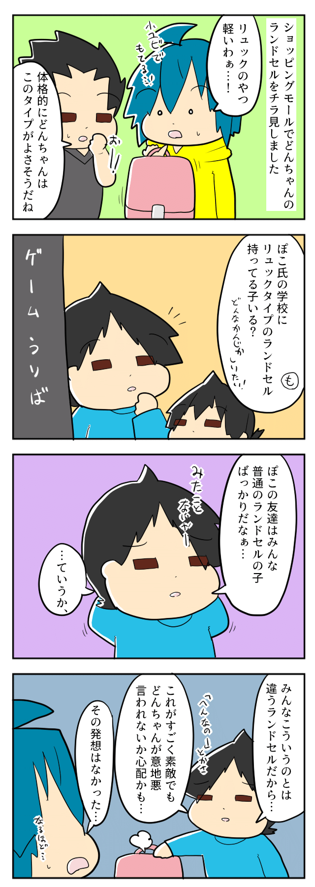 最近リュックタイプのランドセルもたくさん出てきましたよね!軽くて体への負担も少なそうで良いなと思いましたが、子ども目線のぽこちゃんの意見もたしかに・・・と納得ですね。どんちゃんを想って意見をくれるぽこちゃん、優しいお兄ちゃんですね!