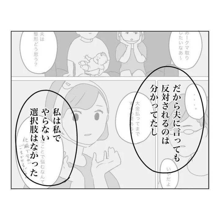 作中でもいもいさんの夫が懸念したように、美容関連は求めだしたらきりがなく、中には依存してしまう人もいるのは事実です。だからこそ、依存しなくてもいいように、秘密で整形しなくて済むように、コンプレックスの相談ができる関係性でいられるといいですよね。