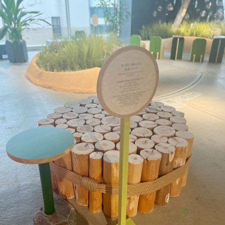 所々に設置されているハラッパのオリジナルファニチャーは、全てサステナブルな視点で作られています。 多摩産材の間伐材の丸太を束にしたベンチはなんだか可愛い!