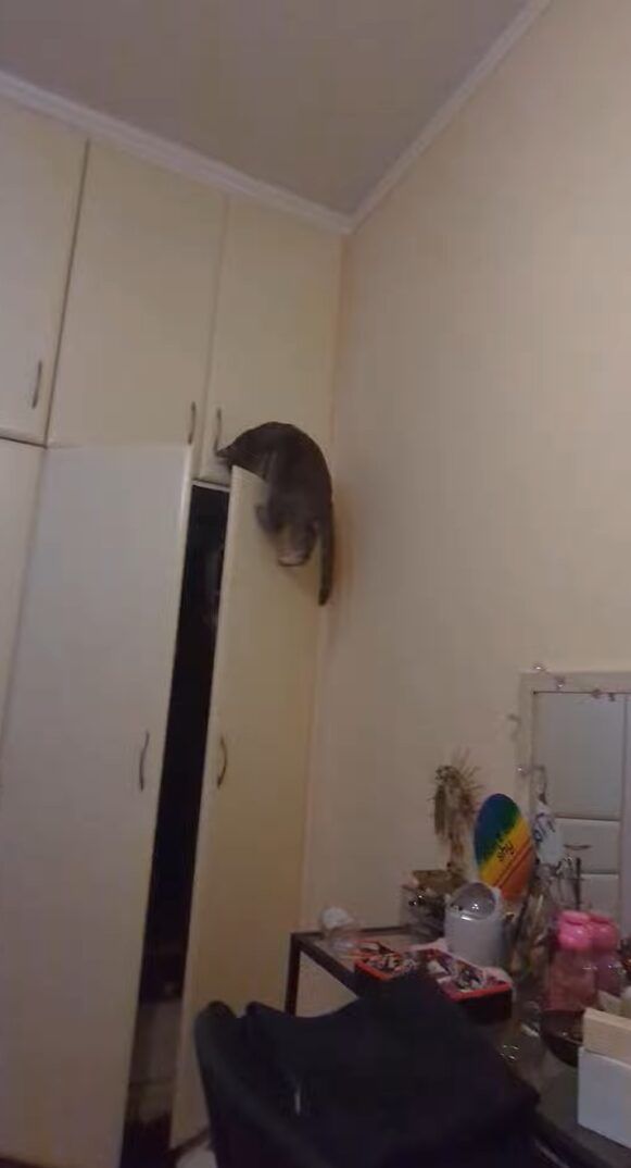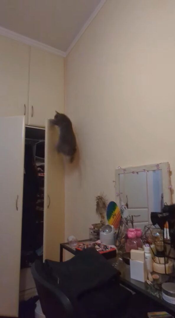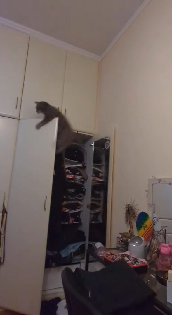 そして、クローゼットの扉の上に見事着地してみせたのです!! どうやら、扉の上に飛び乗ろうと狙いを定めていたので宙を見つめていたようです。